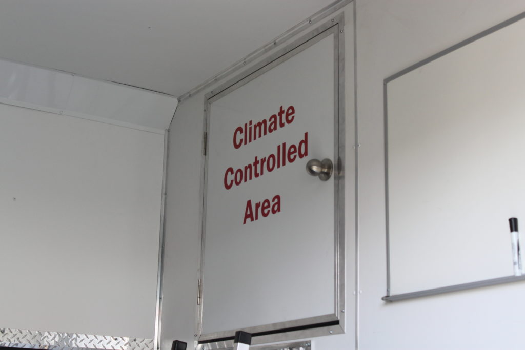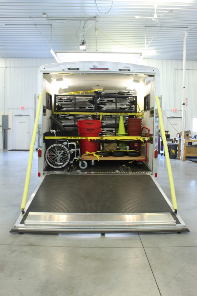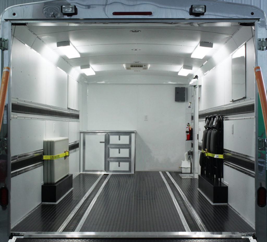 Packages typically include electrical power and lighting, HVAC, an interior height of 7′ (6″ taller than typical trailers), cabinets, a user-friendly loading ramp, strapping system, general supplies and exterior graphics.